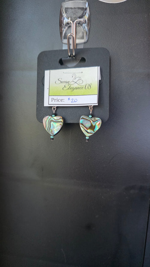 Round hematite and conch beads, featuring metal flowers on surgical steel hooks